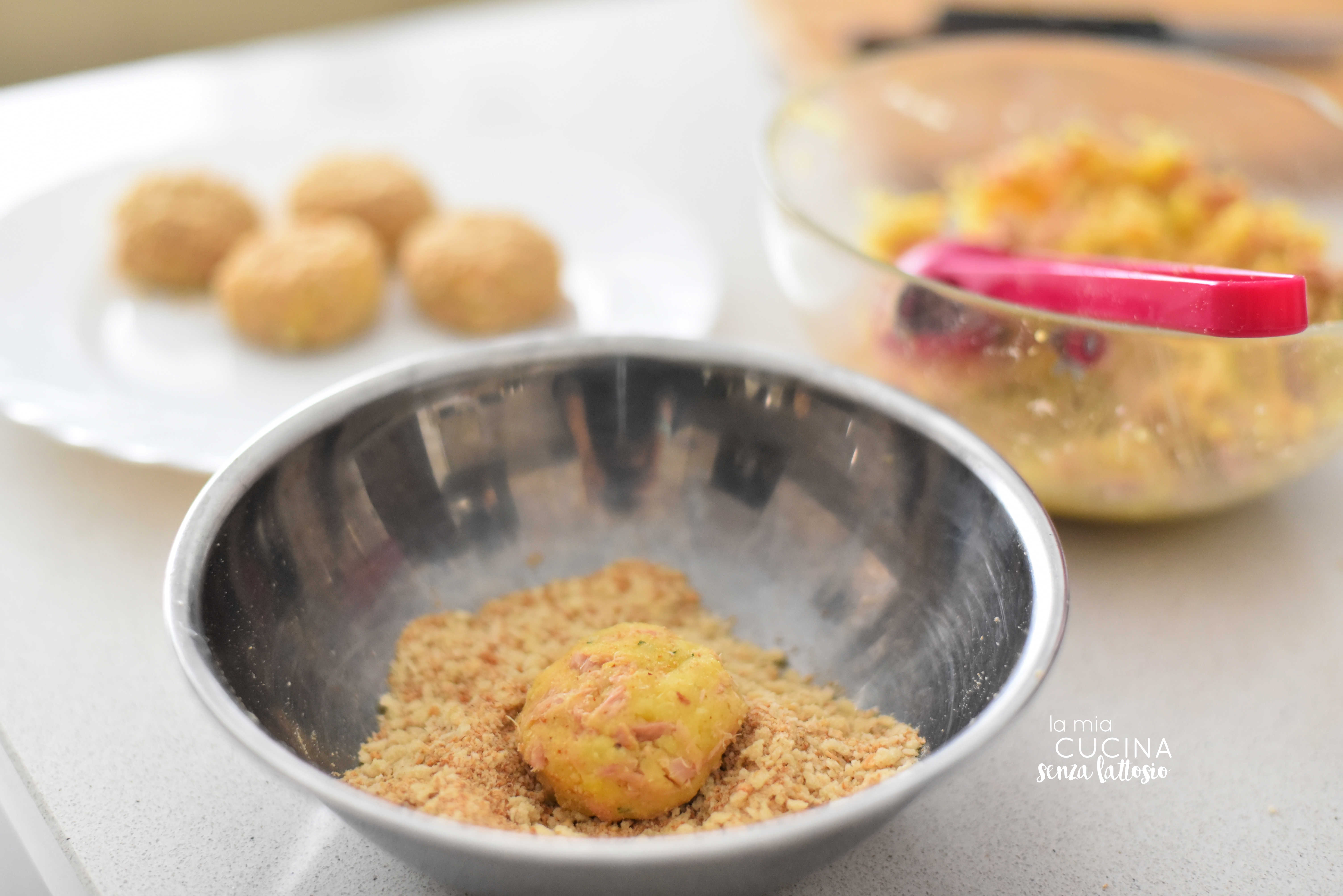 Con le mani umide modellare il composto formando delle polpette ed avvolgerle con la panatura.