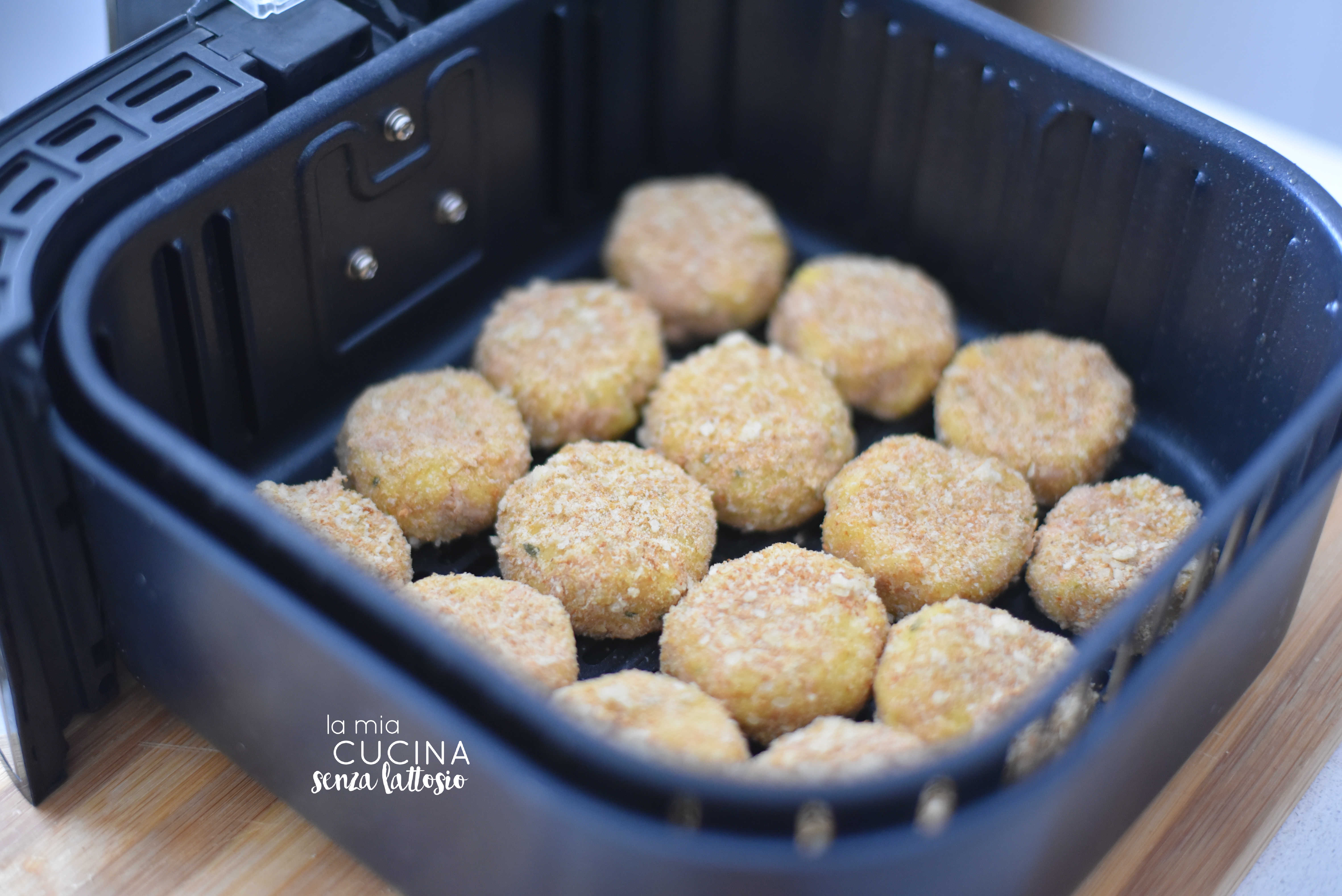 Preriscaldare la friggitrice ad aria (200° per 15 min), distribuire le polpette nel cestello, nebulizzarvi sopra dell’olio e cuocere a 200° per 15 min (oppure cuocere in forno a 180° per 15 – 20 min)