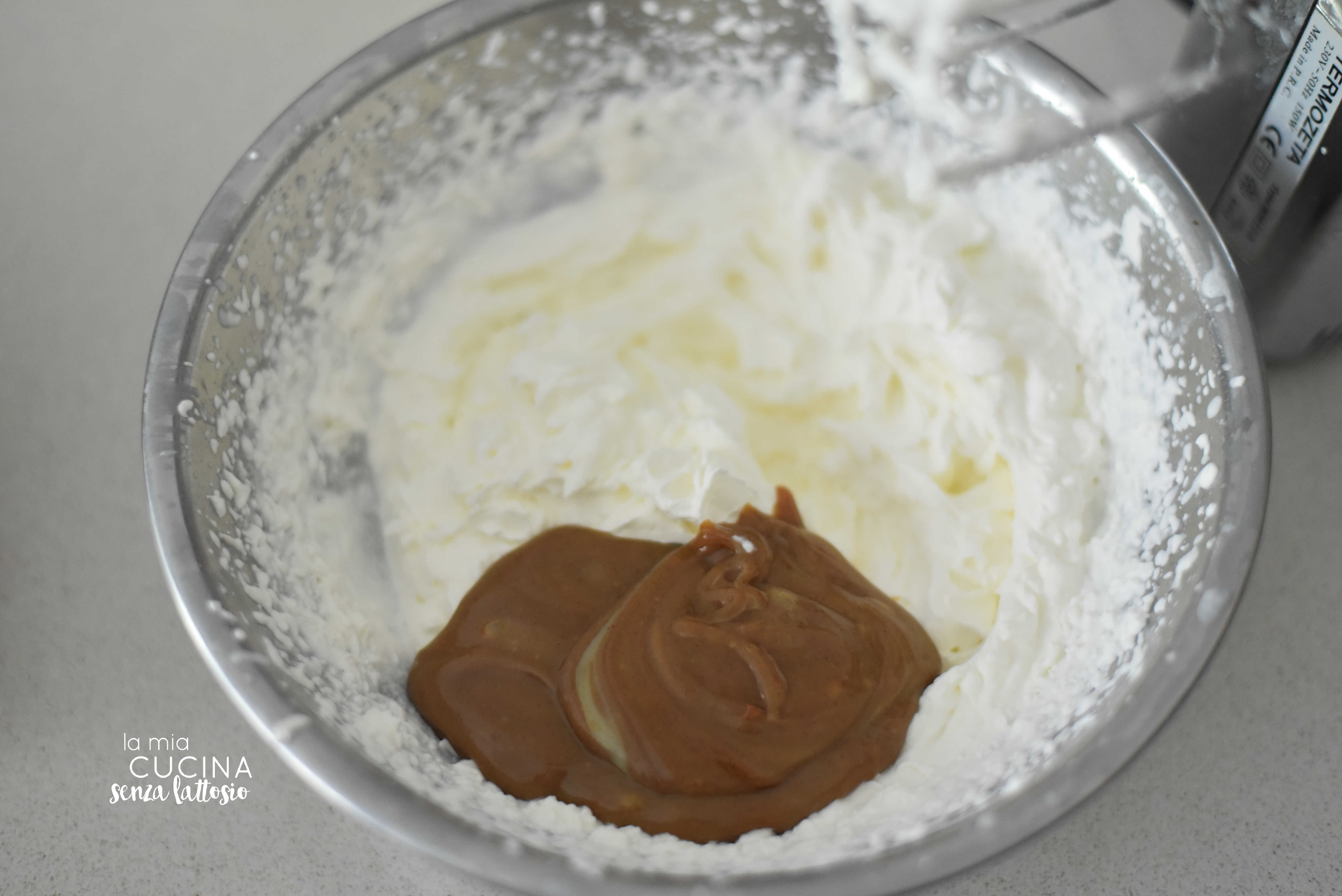 Per una perfetta riuscita con queste temperature altissime dovete tenere tutti gli ingredienti in frigo, compresa la ciotola dove andrete a montare la panna e le fruste dello sbattitore. Fate raffreddare per bene, poi mescolare il latte condensato con la pasta di nocciole (vi consiglio di mescolarla prima perchè, quando ferma, la parte oleosa tende a salire, dovete riamalgamarla per bene prima di unirla al latte condensato)
